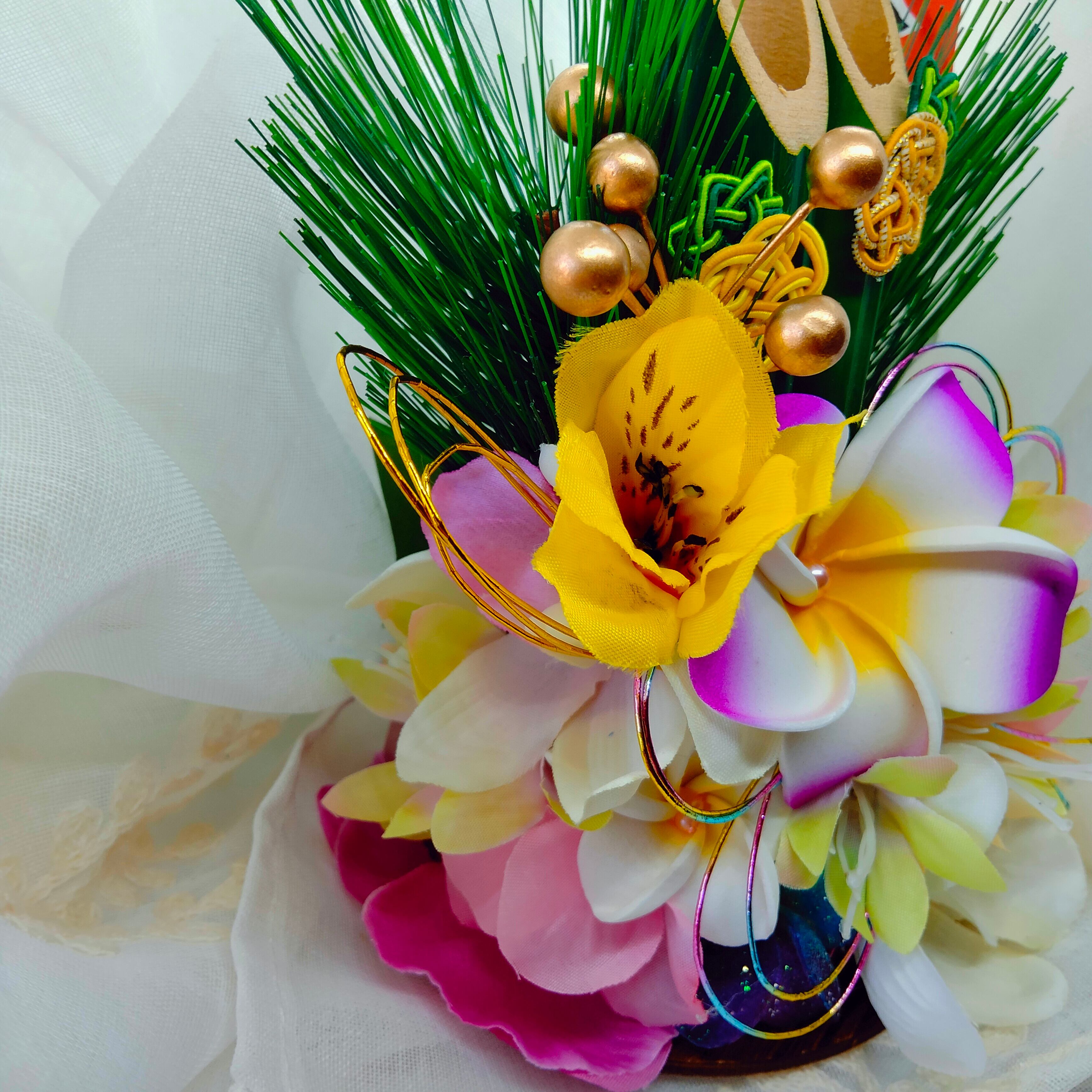 青竹門松にプルメリアなど南国の花と和を合わせた華やかな、お正月飾りです。