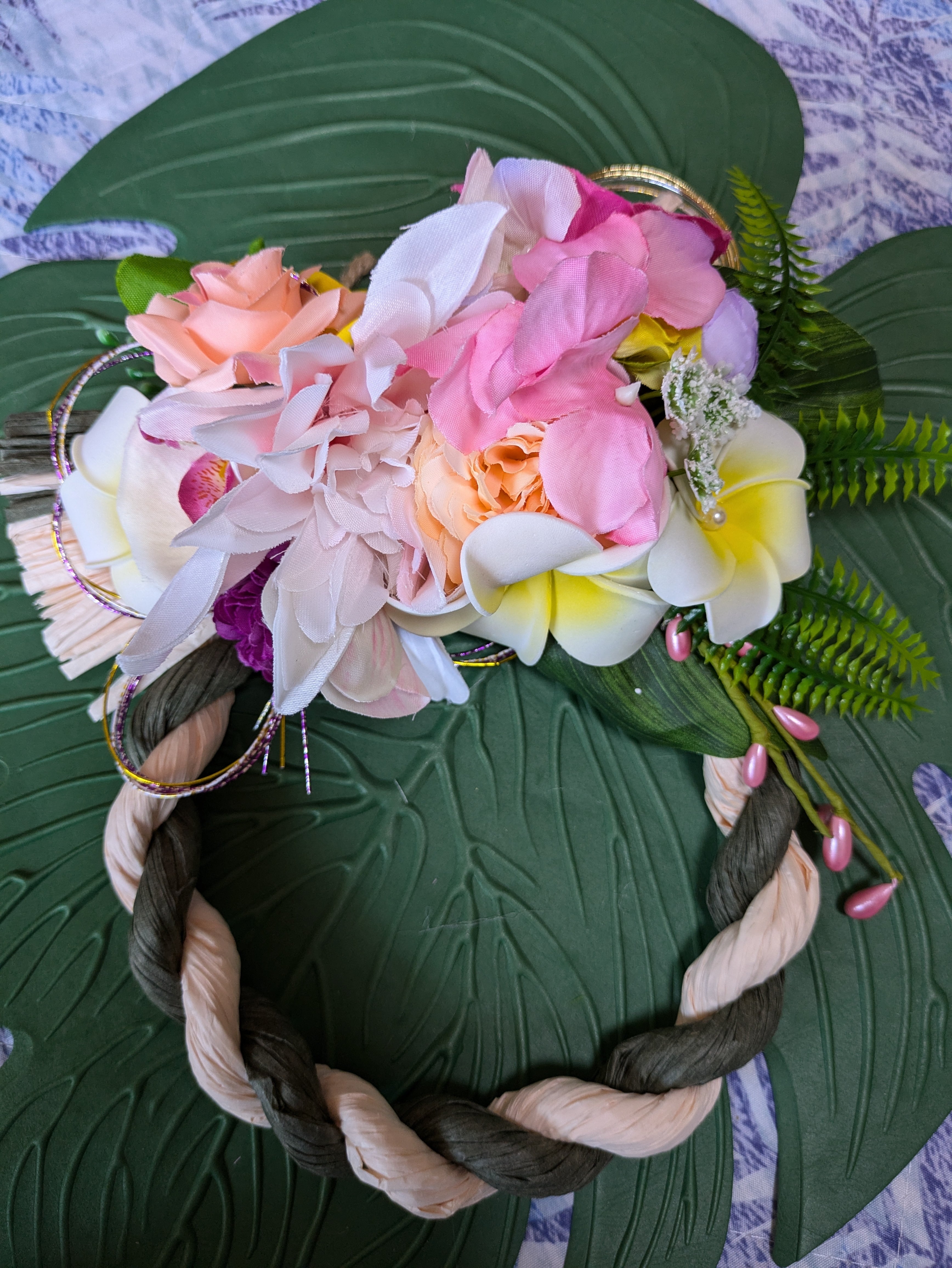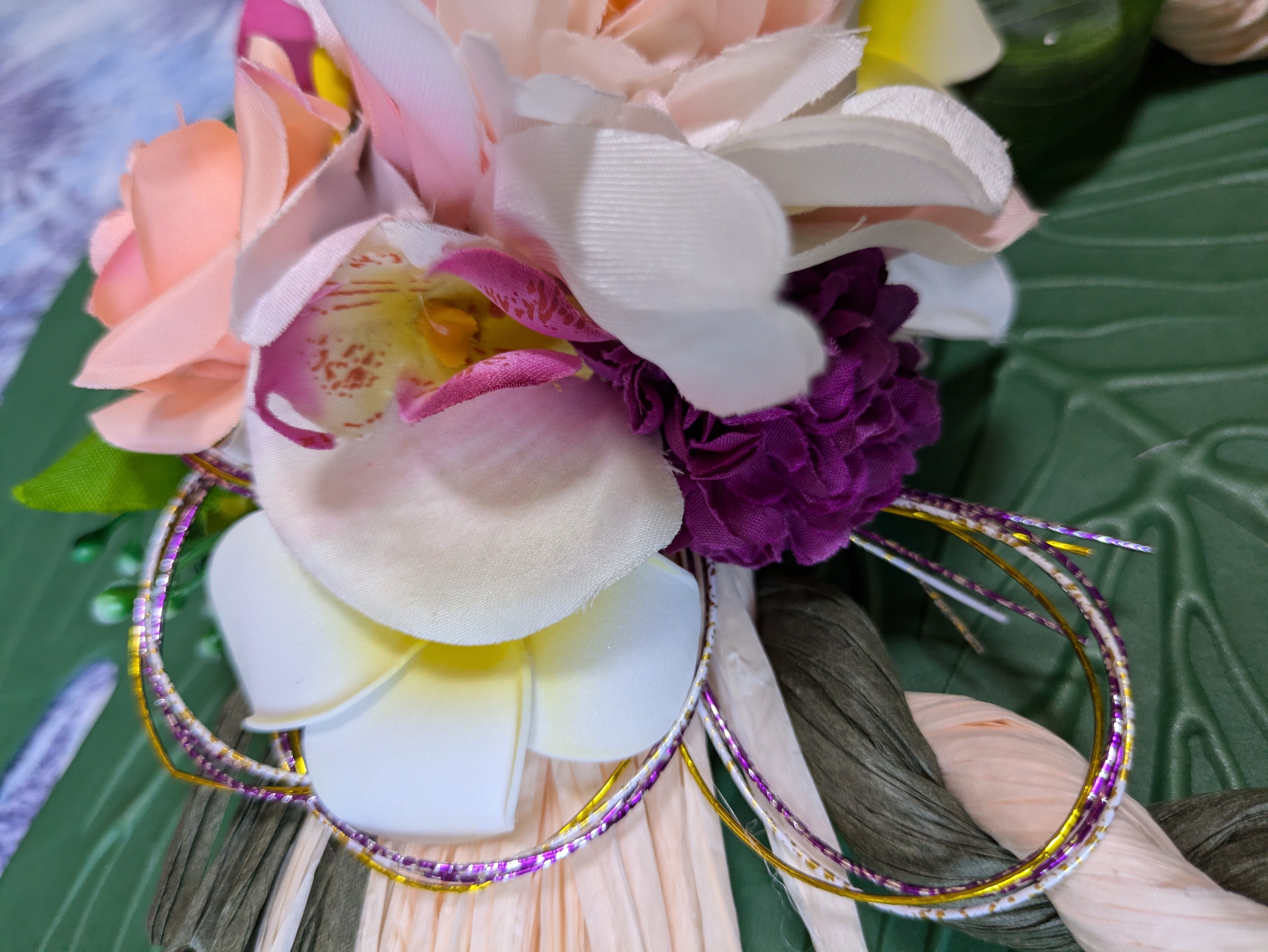 ペーパーしめ縄にプルメリアなど南国の花と和を合わせた華やかなしめ縄飾りです。